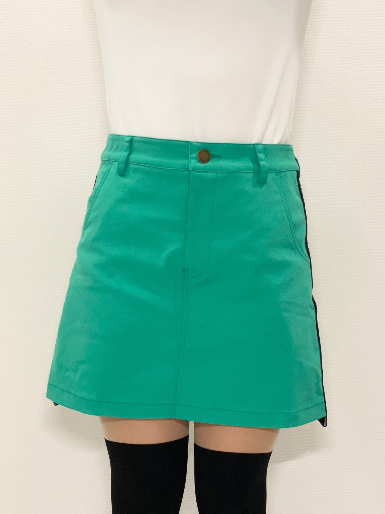 鮮やかなグリーン。前からは一見シンプルなデザイン。サイドにブランドロゴが!スカート丈より少し長めなのもPOINT!